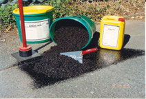 Asphaltmischgut, kalt verarbeitbar; hergestellt aus Gesteinskörnungen, Zusätzen und Spezial-Bindemittel (REaktions-Bitumen).